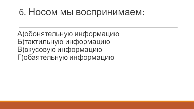 6. Носом мы воспринимаем:  А)обонятельную информацию Б)тактильную информацию В)вкусовую информацию Г)обаятельную информацию