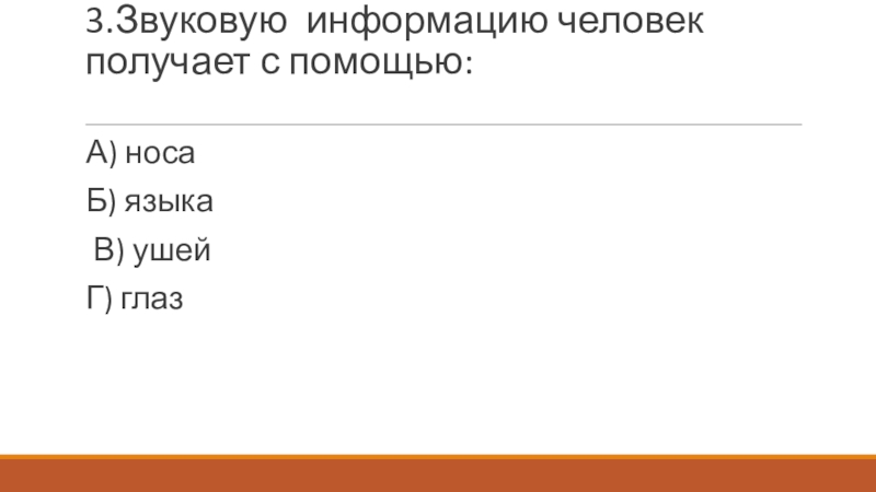 3.Звуковую  информацию человек получает с помощью: А) носаБ) языка В) ушейГ) глаз