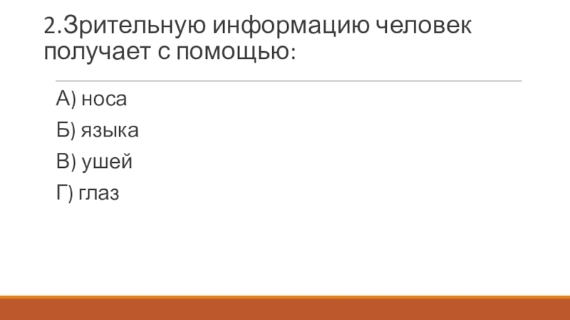 2.Зрительную информацию человек получает с помощью:  А) носаБ) языкаВ) ушейГ) глаз