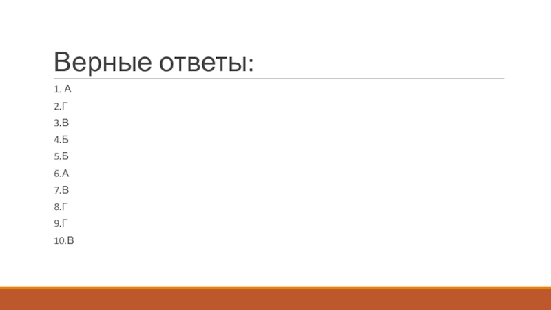 Верные ответы:1. А2.Г3.В4.Б5.Б6.А7.В8.Г9.Г10.В