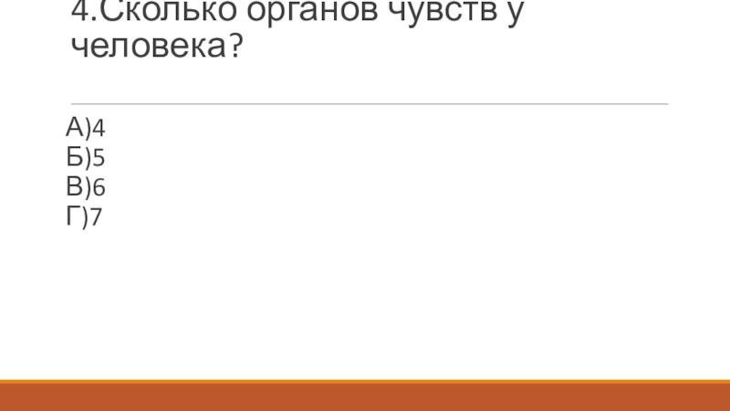 4.Сколько органов чувств у человека?  А)4 Б)5 В)6 Г)7