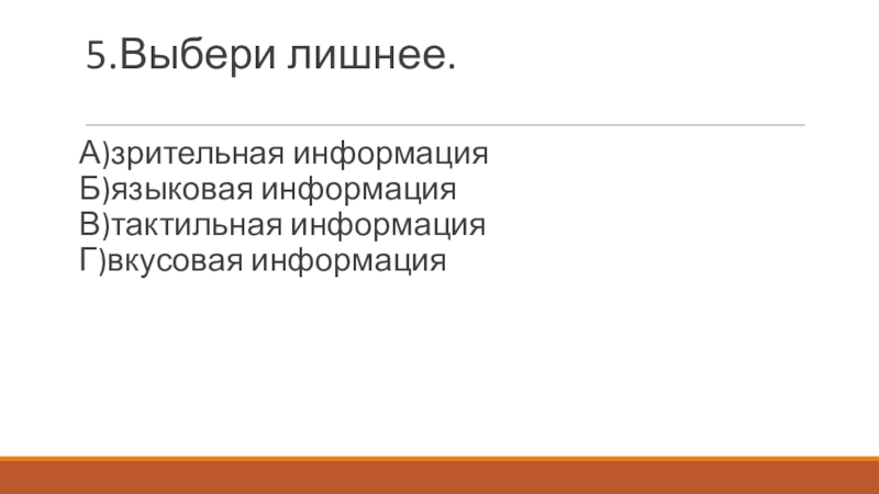 5.Выбери лишнее.  А)зрительная информация Б)языковая информация В)тактильная информация Г)вкусовая информация