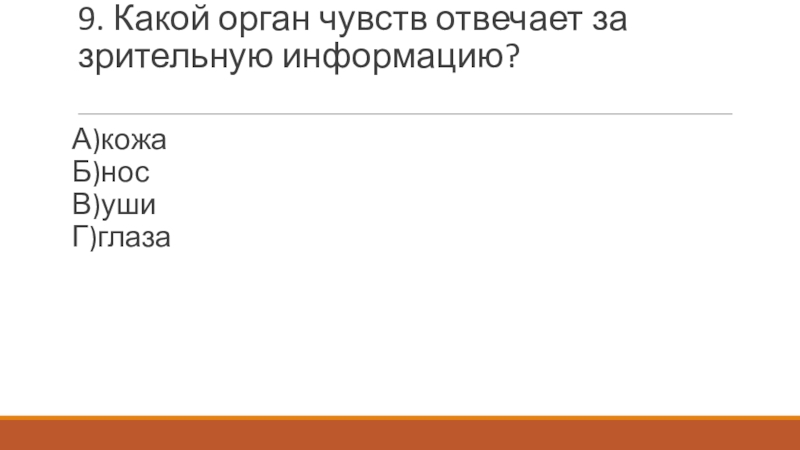 9. Какой орган чувств отвечает за зрительную информацию?  А)кожа Б)нос В)уши Г)глаза