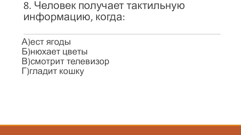 8. Человек получает тактильную информацию, когда:  А)ест ягоды Б)нюхает цветы В)смотрит телевизор Г)гладит кошку