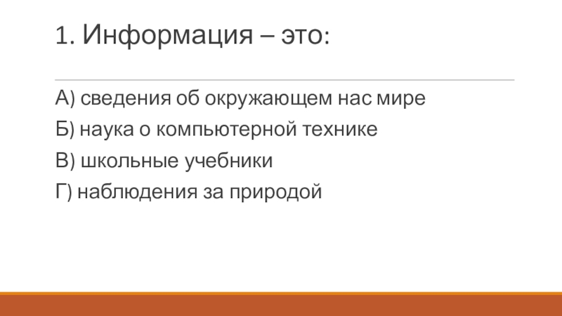 1. Информация – это: А) сведения об окружающем нас миреБ) наука о компьютерной техникеВ) школьные учебникиГ) наблюдения за природой