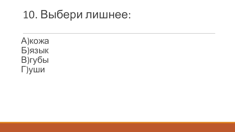 10. Выбери лишнее:  А)кожа Б)язык В)губы Г)уши