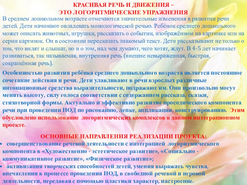 совершенствование речевой деятельности с интеграцией логоритмического компонента в «Художественно - эстетическое развитие», «Социально - коммуникативное развитие», «Физическое развитие»;