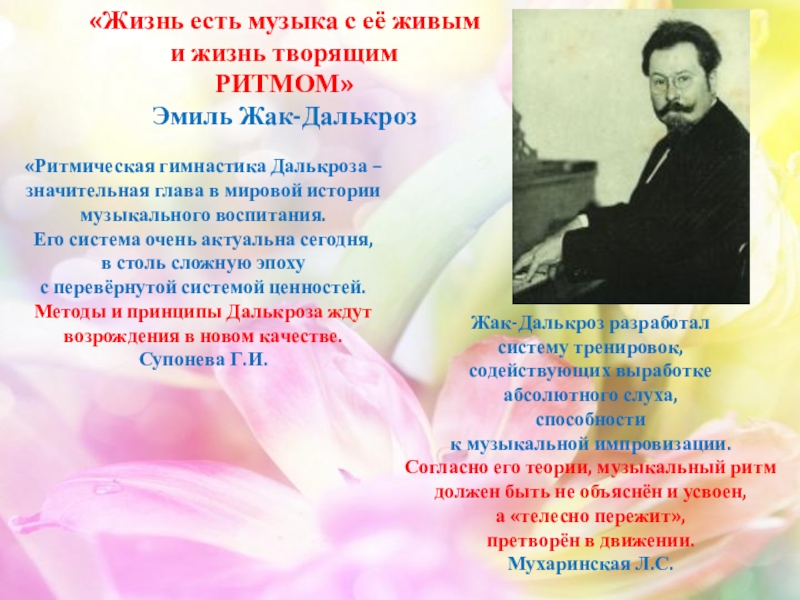 Согласно его теории, музыкальный ритм должен быть не объяснён и усвоен,