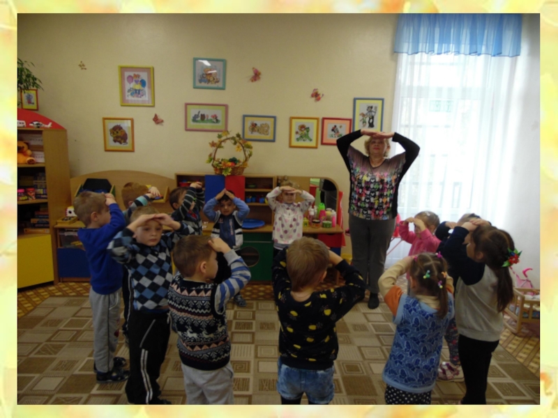 делая ступенчатый выдох, и постепенно опускать руки вниз: «листья опадают».