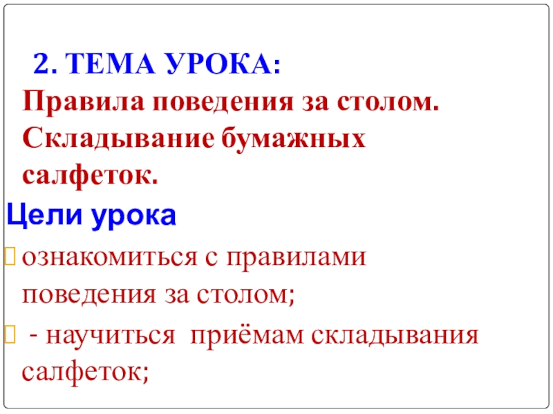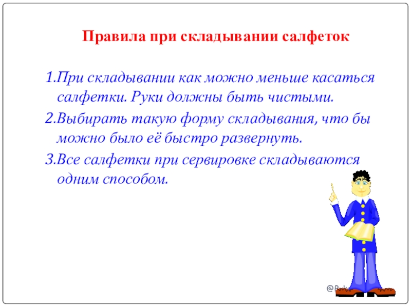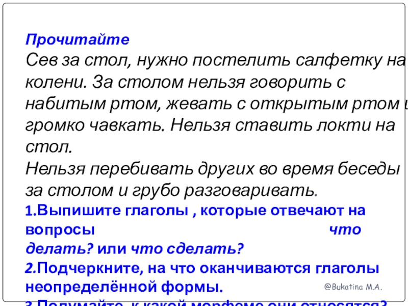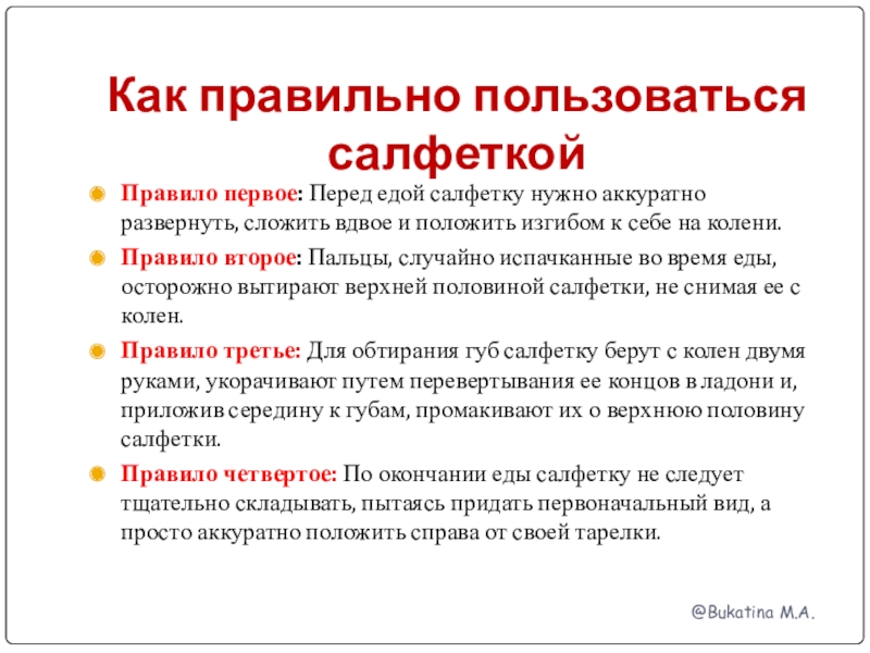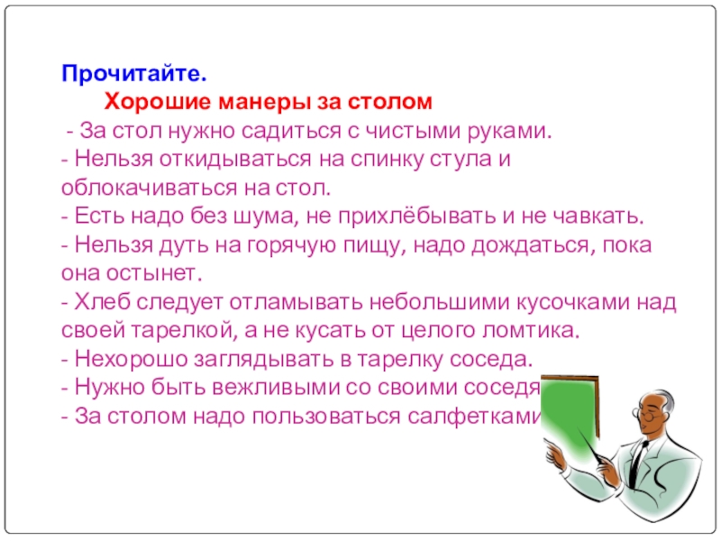 Сев за стол, нужно постелить салфетку на колени. За столом нельзя говорить с набитым ртом, жевать с открытым ртом и громко чавкать. Нельзя ставить локти на стол.