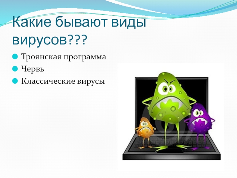 Какие бывают виды вирусов???Троянская программаЧервьКлассические вирусы