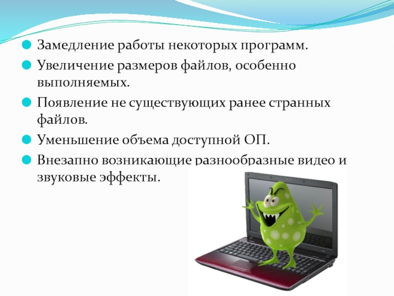 Замедление работы некоторых программ.Увеличение размеров файлов, особенно выполняемых.Появление не существующих ранее странных файлов.Уменьшение объема доступной ОП.Внезапно возникающие
