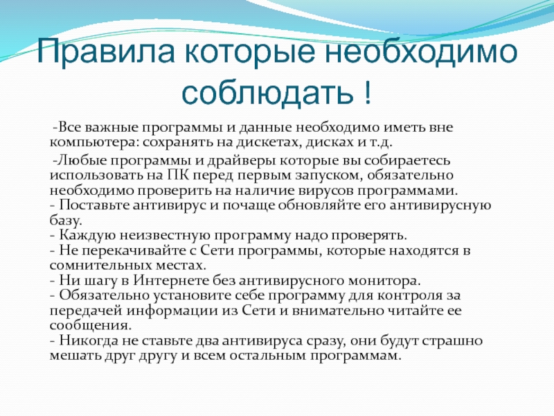 Правила которые необходимо соблюдать !   -Все важные программы и данные необходимо иметь вне компьютера: сохранять
