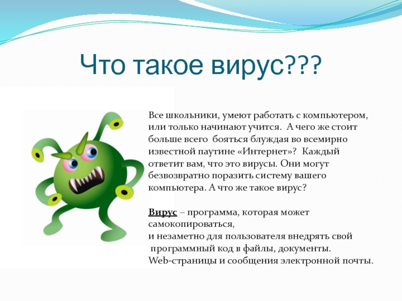 Что такое вирус???Все школьники, умеют работать с компьютером, или только начинают учится. А чего же стоит больше