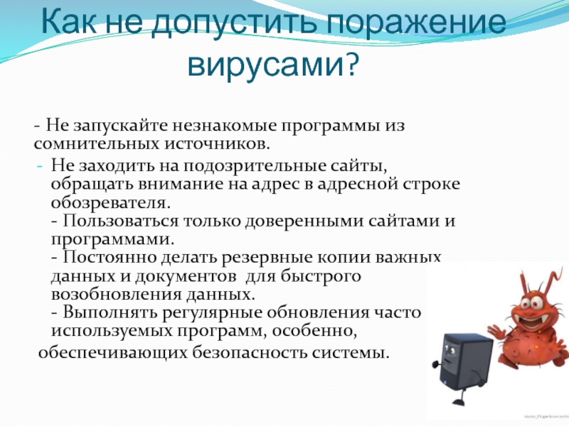 Слайд 9Как не допустить поражение вирусами?