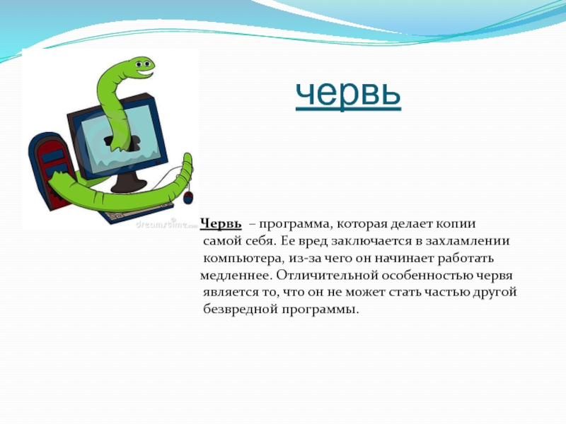 червьЧервь  – программа, которая делает копии самой себя. Ее вред заключается в захламлении компьютера, из-за чего он начинает