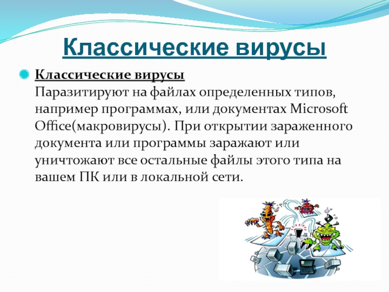 Классические вирусы Паразитируют на файлах определенных типов, например программах, или документах
