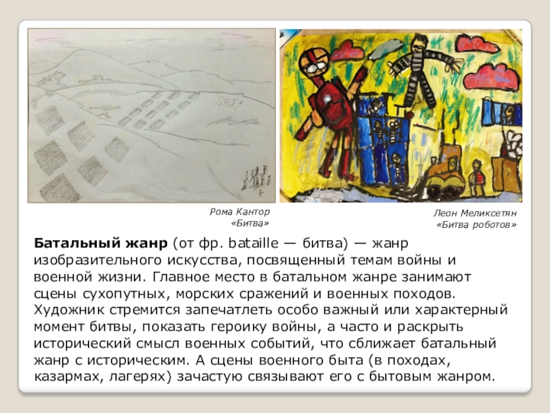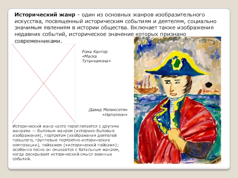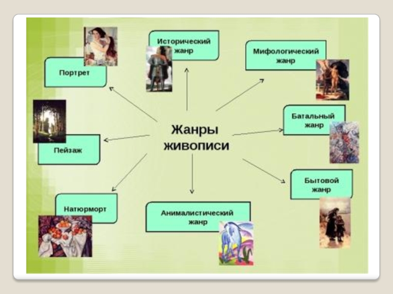 Исторический жанр часто переплетается с другими жанрами — бытовым жанром (историко-бытовые изображения), портретом (изображения деятелей прошлого, групповые портретно-исторические композиции), пейзажем («исторический пейзаж»); особенно тесно он смыкается с батальным жанром, когда раскрывает исторический смысл военных событий.