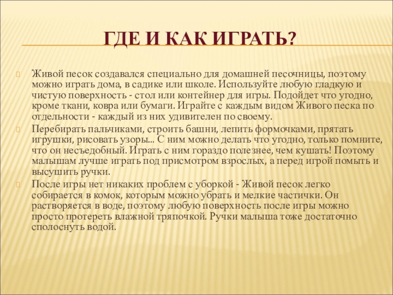 Слайд 8ПРАВИЛА ИСПОЛЬЗОВАНИЯ ЖИВОГО ПЕСКА