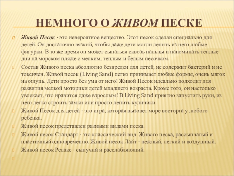 Живой Песок не токсичен, не содержит частиц тяжелых металлов и других вредных веществ.