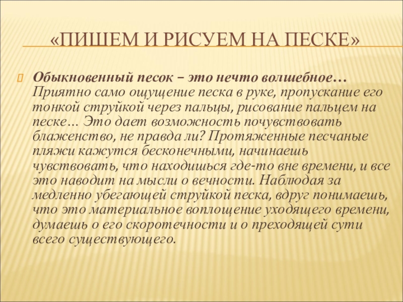 само ощущение песка в руке, пропускание его тонкой струйкой через пальцы, рисование пальцем на песке… Это дает возможность почувствовать блаженство, не правда ли? Протяженные песчаные пляжи кажутся бесконечными, начинаешь чувствовать, что находишься где-то вне времени, и все это наводит на мысли о вечности. Наблюдая за медленно убегающей струйкой песка, вдруг понимаешь, что это материальное воплощение уходящего времени, думаешь о его скоротечности и о преходящей сути всего существующего.