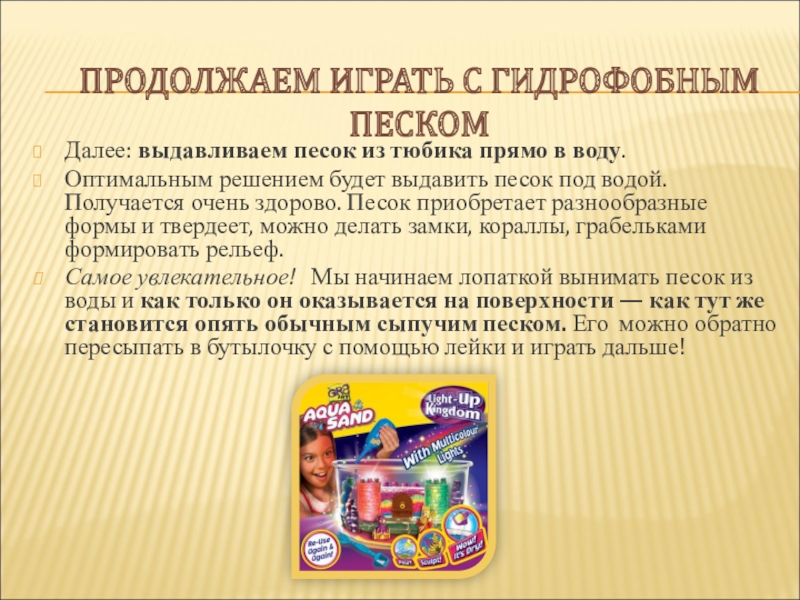 Слайд 15ПРОДОЛЖАЕМ ИГРАТЬ С ГИДРОФОБНЫМ ПЕСКОМ