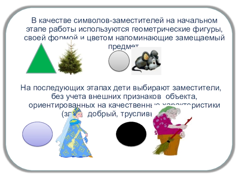 В качестве символов-заместителей на начальном этапе работы используются геометрические фигуры, своей формой и цветом напоминающие замещаемый предмет.