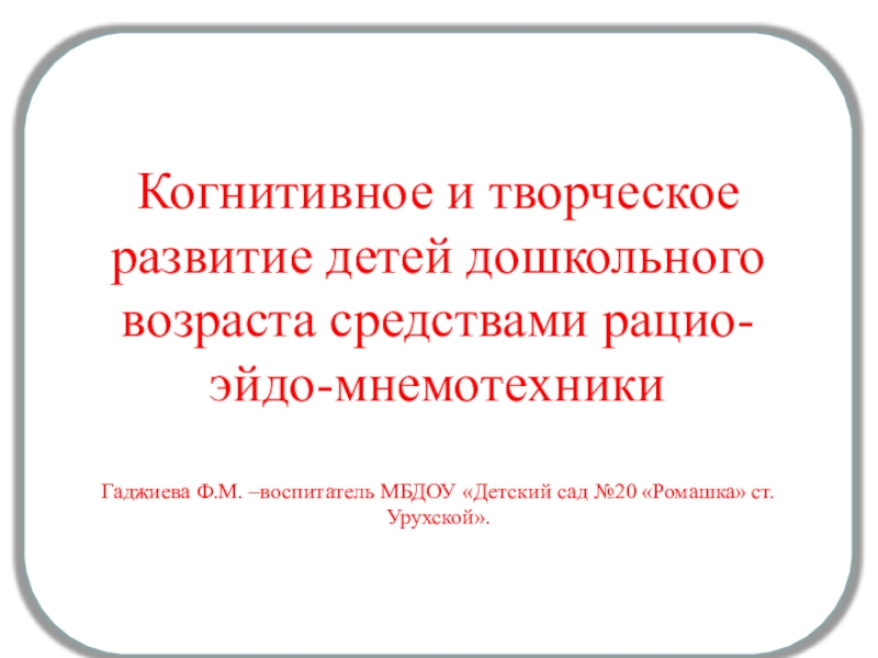 Слайд 1Когнитивное и творческое развитие детей дошкольного возраста средствами рацио-эйдо-мнемотехники