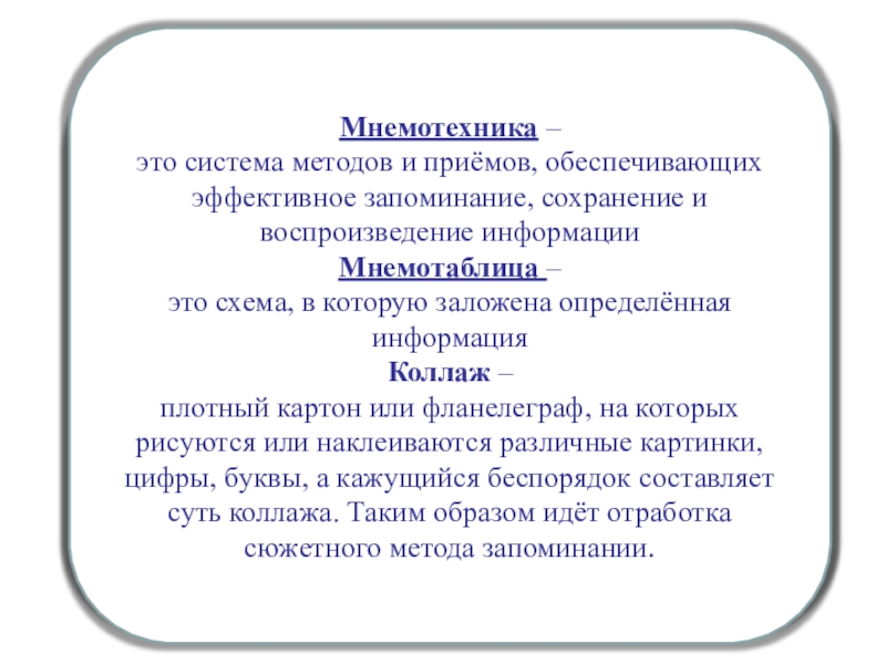 Слайд 7Мнемотехника-это система методов и приёмов, обеспечивающих успешное освоение детьми знаний об