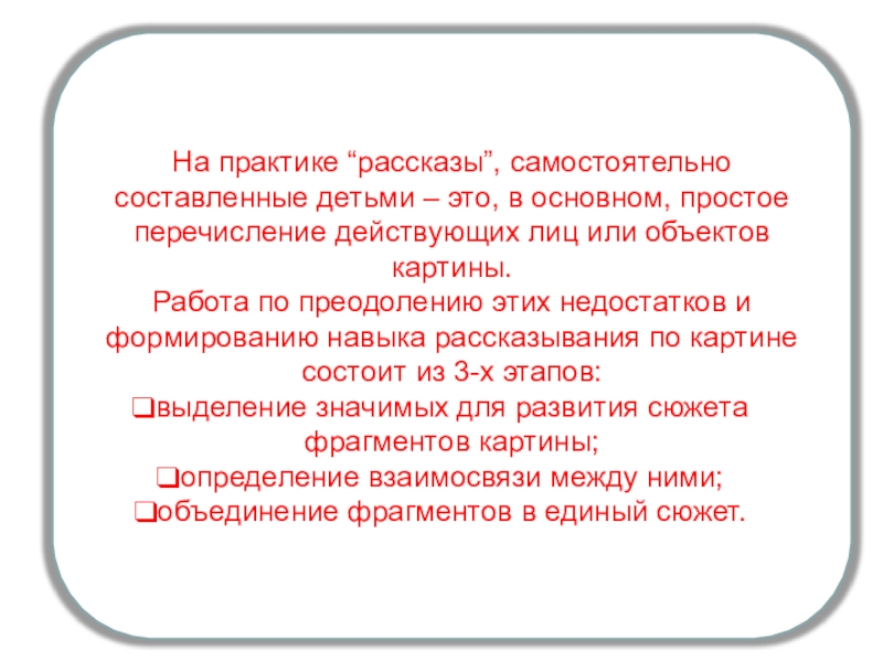 Работа по преодолению этих недостатков и формированию навыка рассказывания по картине состоит из 3-х этапов: