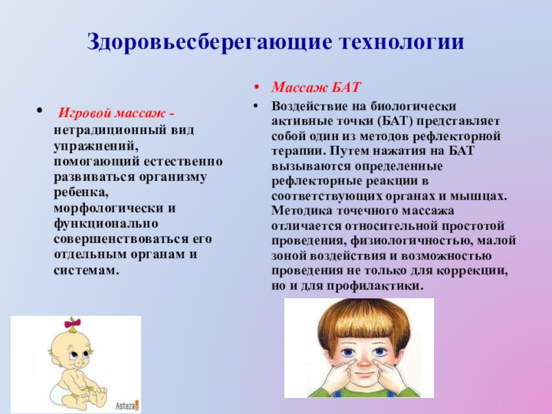Воздействие на биологически активные точки (БАТ) представляет собой один из методов рефлекторной терапии. Путем нажатия на БАТ вызываются определенные рефлекторные реакции в соответствующих органах и мышцах. Методика точечного массажа отличается относительной простотой проведения, физиологичностью, малой зоной воздействия и возможностью проведения не только для коррекции, но и для профилактики.