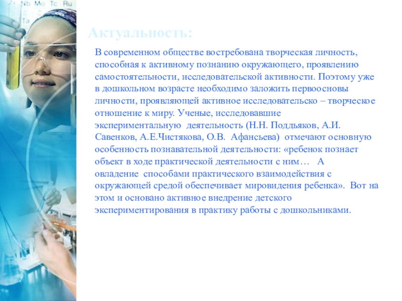 В современном обществе востребована творческая личность, способная к активному познанию окружающего, проявлению самостоятельности, исследовательской активности. Поэтому уже в дошкольном возрасте необходимо заложить первоосновы личности, проявляющей активное исследовательско – творческое отношение к миру. Ученые, исследовавшие экспериментальную деятельность (Н.Н. Поддьяков, А.И.Савенков, А.Е.Чистякова, О.В. Афансьева) отмечают основную особенность познавательной деятельности: «ребенок познает объект в ходе практической деятельности с ним… А овладение способами практического взаимодействия с окружающей средой обеспечивает мировидения ребенка». Вот на этом и основано активное внедрение детского экспериментирования в практику работы с дошкольниками.