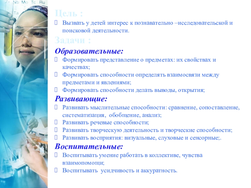 ПРИОТКРЫТЬ ДВЕРЬ ДОШКОЛЬИКАМ В МИР ФИЗИКИ, ХИМИИ, БИОЛОГИИ С НАДЕЖДОЙ НА ДАЛЬНЕЙШЕЕ ИЗУЧЕНИЕ ЭТИХ ПРЕДМЕТНЫХ ОБЛАСТЕЙ В СРЕДНЕЙ И СТАРШЕЙ ШКОЛЕ С БОЛЬШИМ ИНТЕРЕСОМ И ЖЕЛАНИЕМ.