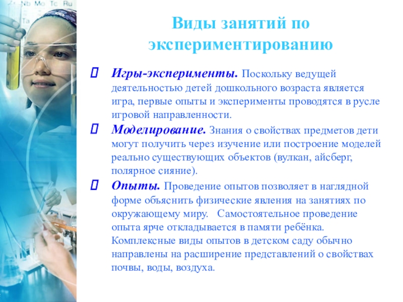 Опыты. Проведение опытов позволяет в наглядной форме объяснить физические явления на занятиях по окружающему миру. Самостоятельное проведение опыта ярче откладывается в памяти ребёнка. Комплексные виды опытов в детском саду обычно направлены на расширение представлений о свойствах почвы, воды, воздуха.