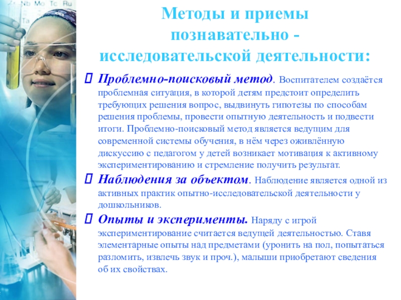 Проблемно-поисковый метод. Воспитателем создаётся проблемная ситуация, в которой детям предстоит определить требующих решения вопрос, выдвинуть гипотезы по способам решения проблемы, провести опытную деятельность и подвести итоги. Проблемно-поисковый метод является ведущим для современной системы обучения, в нём через оживлённую дискуссию с педагогом у детей возникает мотивация к активному экспериментированию и стремление получить результат.
