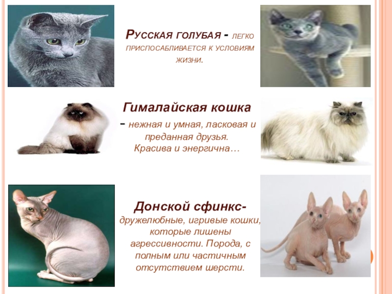 Донской сфинкс- дружелюбные, игривые кошки, которые лишены агрессивности. Порода, с полным или частичным отсутствием шерсти.