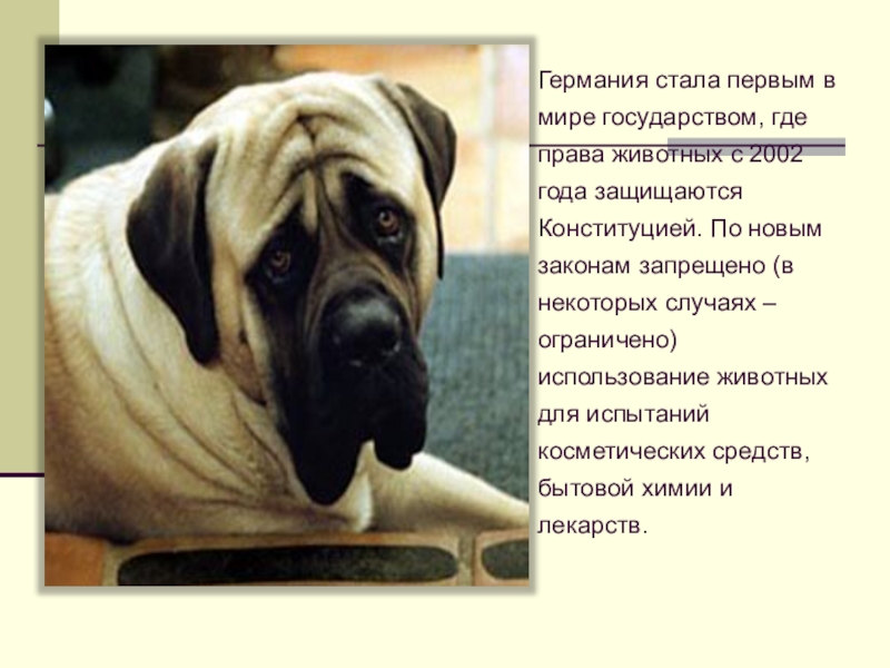 года защищаются Конституцией. По новым законам запрещено (в некоторых случаях – ограничено) использование животных для испытаний косметических средств, бытовой химии и лекарств.