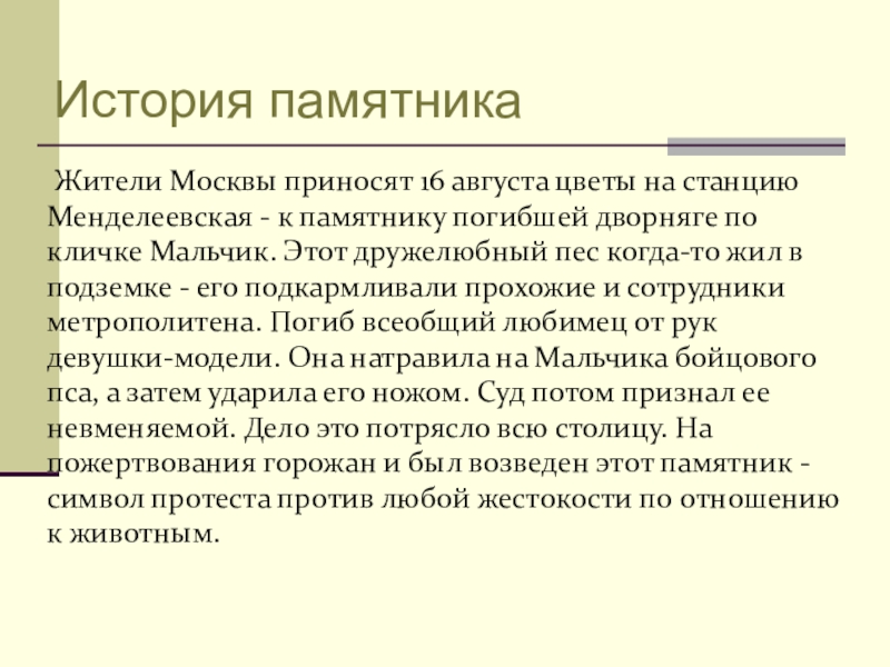 - к памятнику погибшей дворняге по кличке Мальчик. Этот дружелюбный пес когда-то жил в подземке - его подкармливали прохожие и сотрудники метрополитена. Погиб всеобщий любимец от рук девушки-модели. Она натравила на Мальчика бойцового пса, а затем ударила его ножом. Суд потом признал ее невменяемой. Дело это потрясло всю столицу. На пожертвования горожан и был возведен этот памятник - символ протеста против любой жестокости по отношению к животным.
