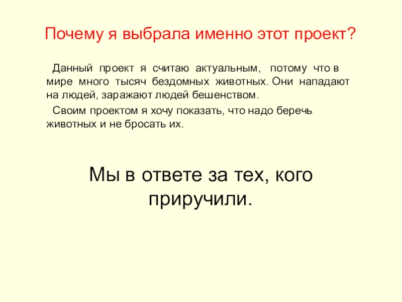 Своим проектом я хочу показать, что надо беречь животных и не бросать их.