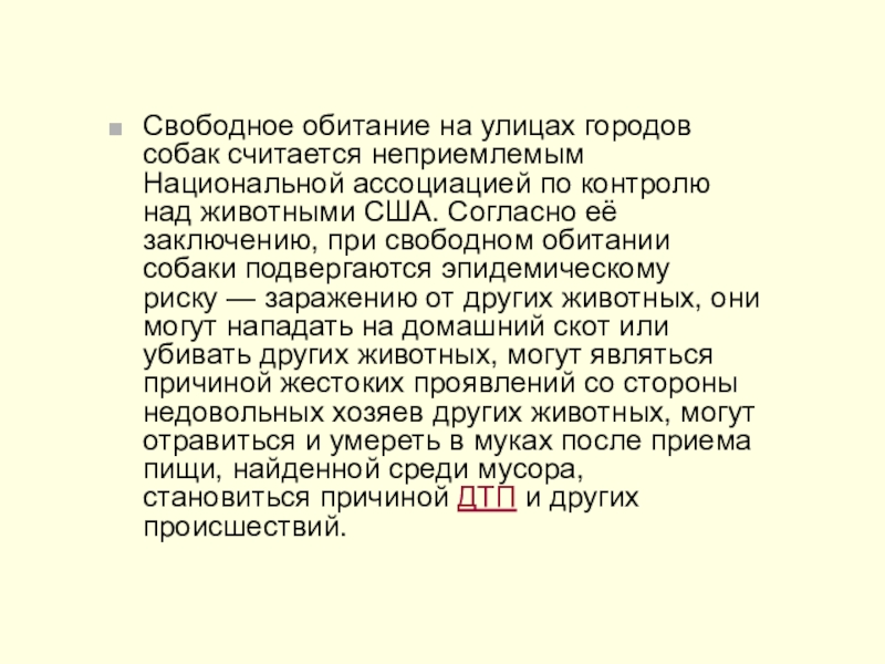 Слайд 7Свободное обитание на улицах городов собак считается неприемлемым Национальной ассоциацией по