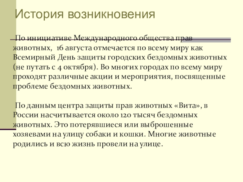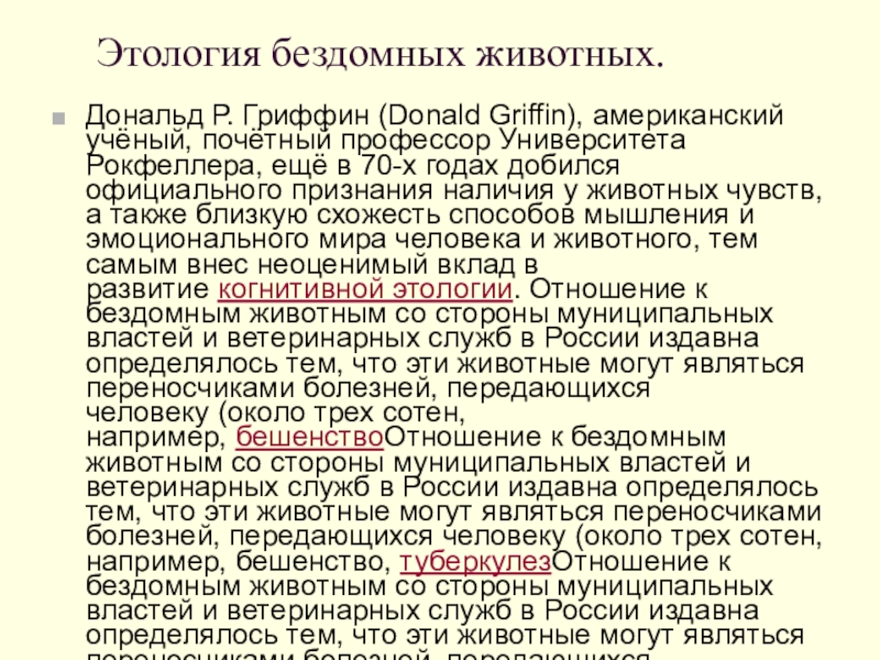 ещё в 70-х годах добился официального признания наличия у животных чувств, а также близкую схожесть способов мышления и эмоционального мира человека и животного, тем самым внес неоценимый вклад в развитие когнитивной этологии. Отношение к бездомным животным со стороны муниципальных властей и ветеринарных служб в России издавна определялось тем, что эти животные могут являться переносчиками болезней, передающихся человеку (около трех сотен, например, бешенствоОтношение к бездомным животным со стороны муниципальных властей и ветеринарных служб в России издавна определялось тем, что эти животные могут являться переносчиками болезней, передающихся человеку (около трех сотен, например, бешенство, туберкулезОтношение к бездомным животным со стороны муниципальных властей и ветеринарных служб в России издавна определялось тем, что эти животные могут являться переносчиками болезней, передающихся человеку (около трех сотен, например, бешенство, туберкулез, демодекозОтношение к бездомным животным со стороны муниципальных властей и ветеринарных служб в России издавна определялось тем, что эти животные могут являться переносчиками болезней, передающихся человеку (около трех сотен, например, бешенство, туберкулез, демодекоз, различные гельминтозы («глисты»).
