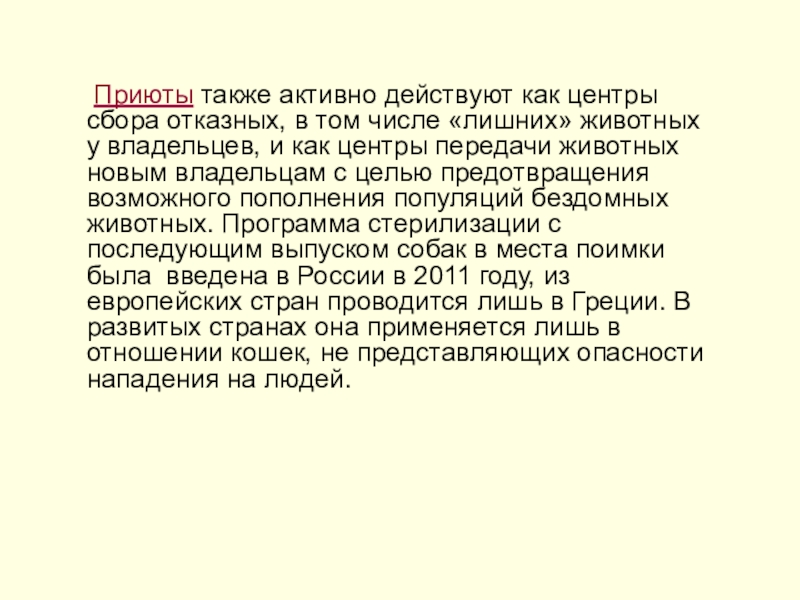 животных у владельцев, и как центры передачи животных новым владельцам с целью предотвращения возможного пополнения популяций бездомных животных. Программа стерилизации с последующим выпуском собак в места поимки была введена в России в 2011 году, из европейских стран проводится лишь в Греции. В развитых странах она применяется лишь в отношении кошек, не представляющих опасности нападения на людей.