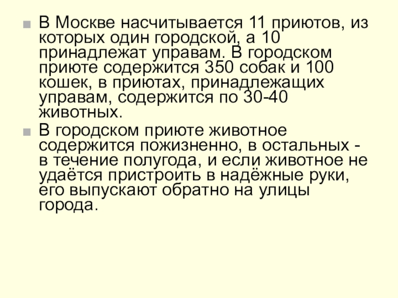 принадлежат управам. В городском приюте содержится 350 собак и 100 кошек, в приютах, принадлежащих управам, содержится по 30-40 животных.