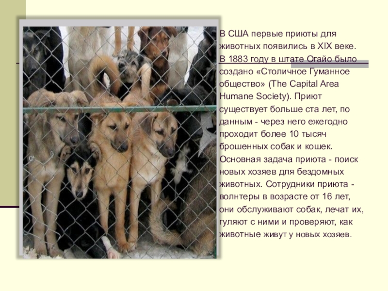 1883 году в штате Огайо было создано «Столичное Гуманное общество» (The Capital Area Humane Society). Приют существует больше ста лет, по данным - через него ежегодно проходит более 10 тысяч брошенных собак и кошек. Основная задача приюта - поиск новых хозяев для бездомных животных. Сотрудники приюта - волнтеры в возрасте от 16 лет, они обслуживают собак, лечат их, гуляют с ними и проверяют, как животные живут у новых хозяев.