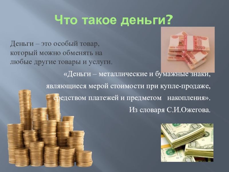 Деньги – это особый товар, который можно обменять на любые другие товары и услуги.