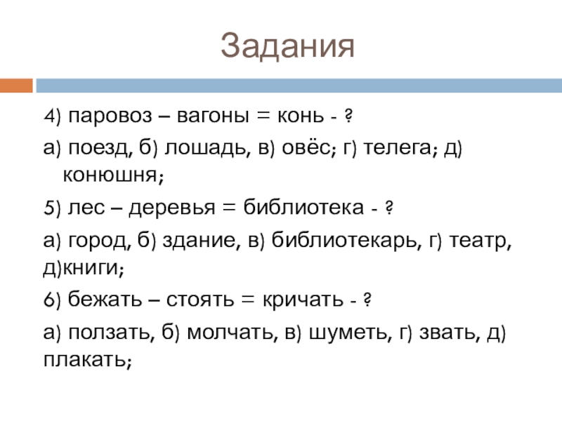 4) паровоз – вагоны = конь - ?