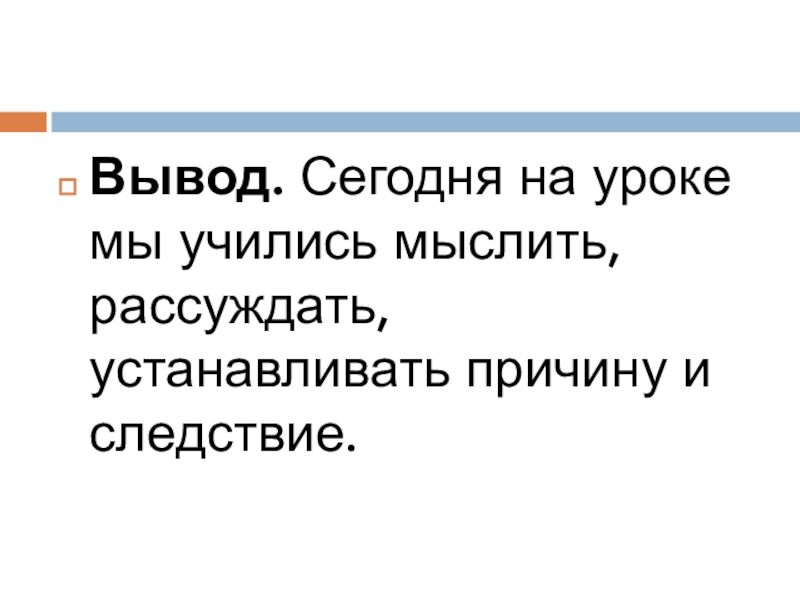 Слайд 24Вывод. Сегодня на уроке мы учились мыслить, рассуждать, устанавливать причину и