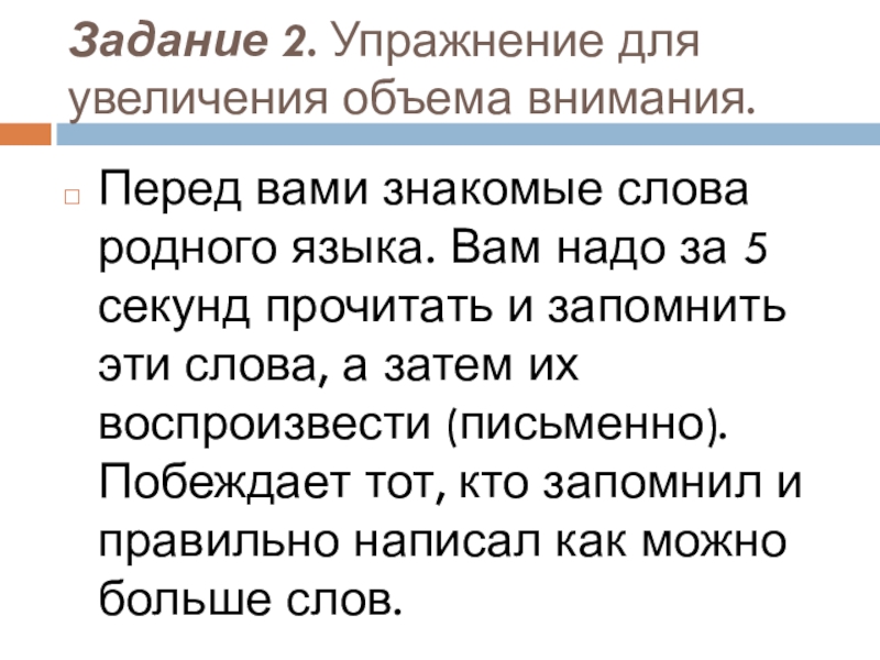 Слайд 8Задание 2. Упражнение для увеличения объема внимания.