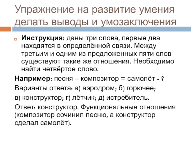 Слайд 18Упражнение на развитие умения делать выводы и умозаключения