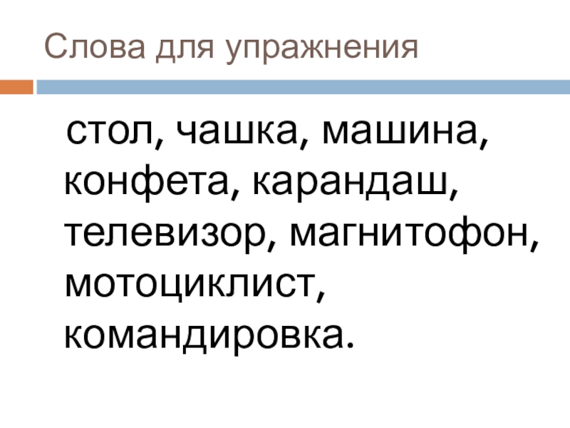 стол, чашка, машина, конфета, карандаш, телевизор, магнитофон, мотоциклист, командировка.
